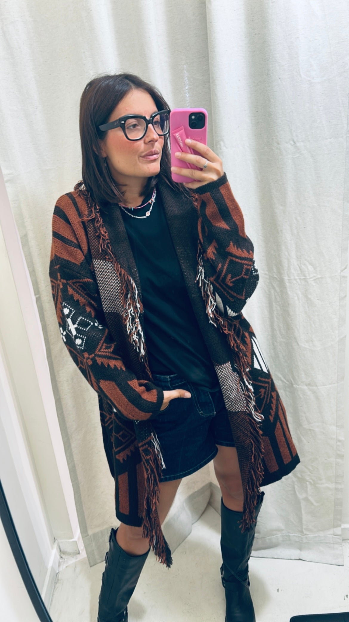 Kimono in maglia in fantasia etnica nei toni del ruggine. Dettagli frange e cintura in vita. Taglia unica