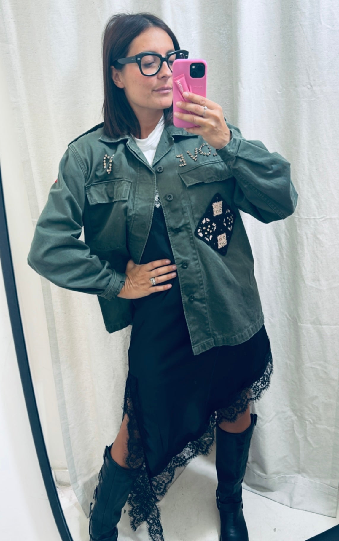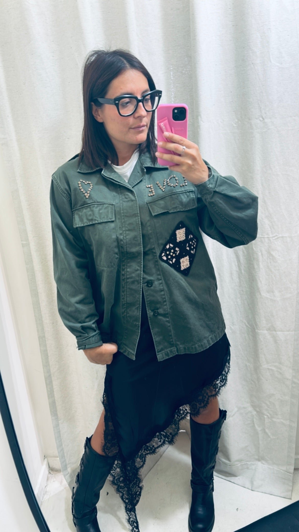 Giacca vintage con inserti e brillantini. Ha la scritta love e un cuore di brillantini. Taglia unica